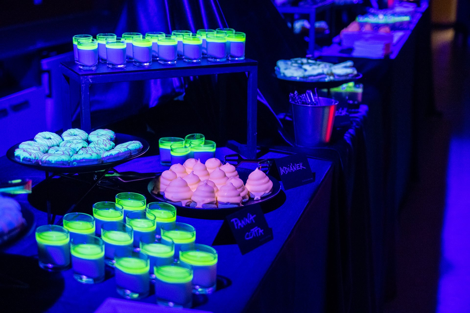October 2018 | As part of the Prague Signal Festival, we collaborated with QUIX on the NEON FOOD LOUNGE - a big neon party in the tent of the Žofín Garden restaurant. Under UV lights everything glowed, the guests as well as drinks and sweets. Our guests enjoyed Prosecco with UV passion fruit caviar, bubble tea with lychee or neon magnums, ice cream, waffles, panna cotta, donuts and much more. For the very hungry, our food truck offered hot meals, such as poutine, hotdogs and burgers.