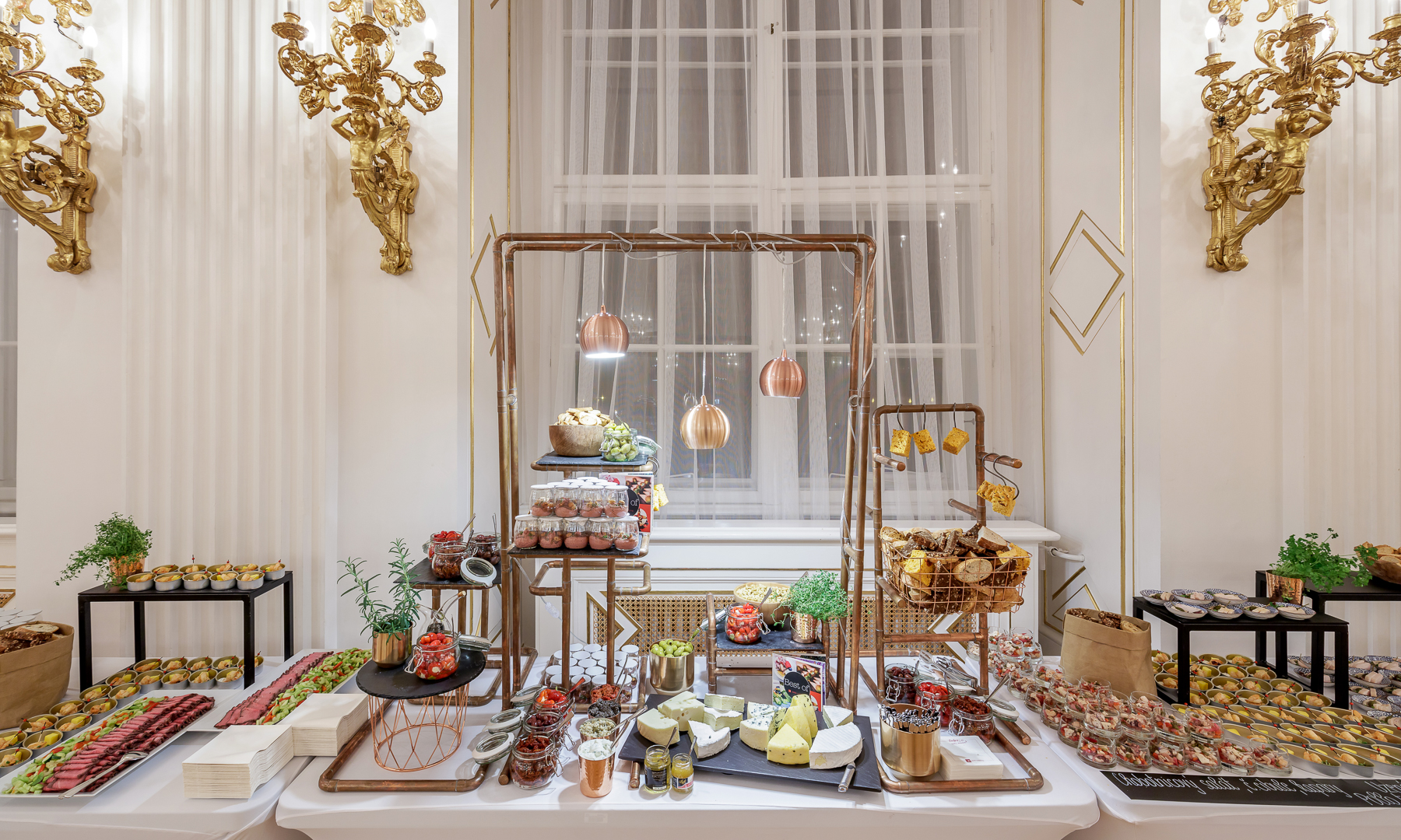 February 2019 | At the European Congress, of which we were partners, we prepared refreshments for 160 guests from all over Europe. The Art Deco Hall of the Empire Hall in the Slovansky House was illuminated by our table mapping projections and our catering innovations. In addition to the "spoon wall" tasting, the guests enjoyed a mozzarella show, a salami bar, an "eating park“ with shrimp skewers, Chocoland with a chocolate river and the Pavlova show on a backlit stage. They also had great fun at the self-service alchemist bar.